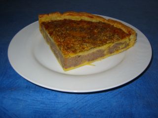 in Würfel schneiden, mit Hackfleischteig mischen und auf dem Blätterteig
